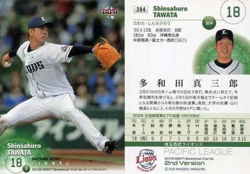 Nombre comercial en japonés: BBM/レギュラーカード/埼玉西武ライオンズ/BBM2018 ベースボールカード 2ndバージョン 394 [レギュラーカード] : 多和田真三郎