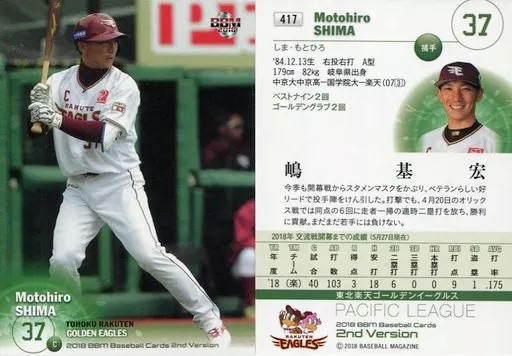 Nombre comercial en japonés: BBM/レギュラーカード/東北楽天ゴールデンイーグルス/BBM2018 ベースボールカード 2ndバージョン 417 [レギュラーカード] : 嶋基宏