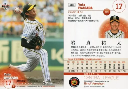 Nombre comercial en japonés: BBM/レギュラーカード/阪神タイガース/BBM2018 ベースボールカード 2ndバージョン 500 [レギュラーカード] : 岩貞祐太