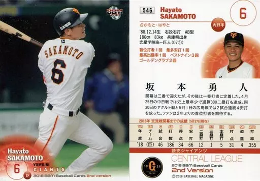 Nombre comercial en japonés: BBM/レギュラーカード/読売ジャイアンツ/BBM2018 ベースボールカード 2ndバージョン 546 [レギュラーカード] : 坂本勇人(縦向き)