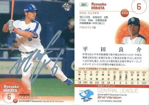 Nombre comercial en japonés: BBM/レギュラーカード/中日ドラゴンズ/BBM2018 ベースボールカード 2ndバージョン 567 [レギュラーカード] : 平田良介(銀箔押しサイン入り)