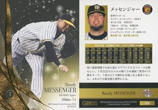 Nombre comercial en japonés: BBM/レギュラーカード/阪神タイガース/BBM2018 ジェネシス 066 [レギュラーカード] : メッセンジャー