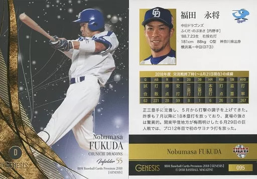 BBM / Regular Card / Chunichi Dragons / BBM2018 Genesis 095 [tarjeta regular] : Nagamasa Fukuda