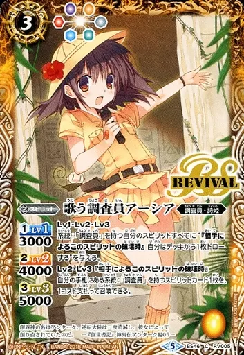 Nombre comercial en japonés: バトルスピリッツ/C/スピリット/神煌臨編 第3章 神々の運命 BS46-RV005[C]:歌う調査員アーシア