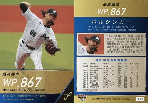 Nombre comercial en japonés: BBM/レギュラーカード/タイトルホルダー/千葉ロッテマリーンズ/BBM2018 FUSION 111 [レギュラーカード] : 最高勝率 ボルシンガー