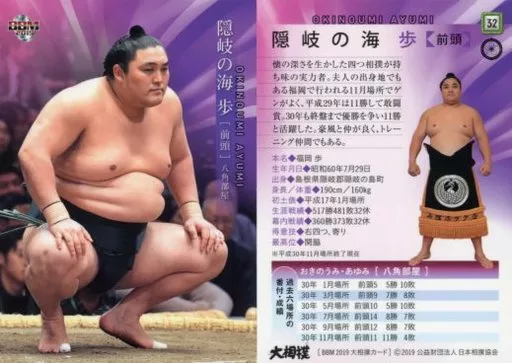Nombre comercial en japonés: BBM/レギュラーカード/前頭/BBM2019 大相撲カード 32 [レギュラーカード] : 隠岐の海 歩