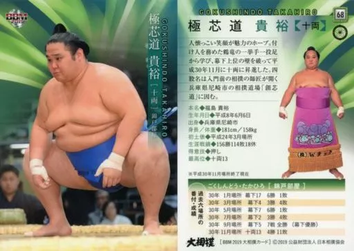 Nombre comercial en japonés: BBM/レギュラーカード/十両/BBM2019 大相撲カード 68 [レギュラーカード] : 極芯道 貴裕