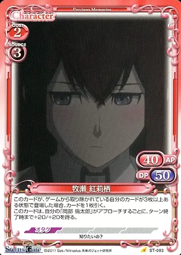 Nombre comercial en japonés: プレシャスメモリーズ/ST/キャラクター/赤/STEINS;GATE ブースターパック ST-003[ST]:牧瀬 紅莉栖