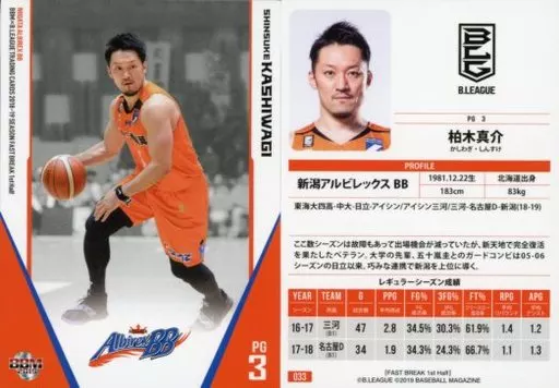 Nombre comercial en japonés: BBM/レギュラーカード/新潟アルビレックスBB/BBM2019 B.LEAGUE TRADING CARDS 2018-19 SEASON FAST BREAK 1st Half 033 [レギュラーカード] : 柏木真介