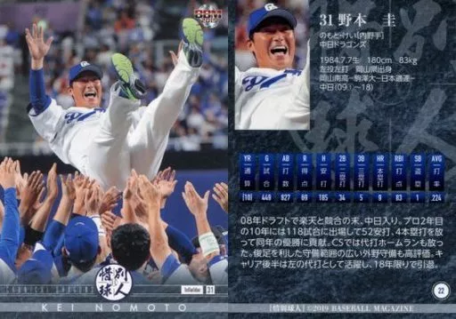 Nombre comercial en japonés: BBM/レギュラーカード/中日ドラゴンズ/BBM2019 惜別球人 22 [レギュラーカード] : 野本圭