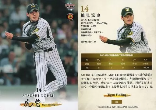 Nombre comercial en japonés: BBM/レギュラーカード/阪神タイガース/BBM2014 虎の砦 Tigers Fielding 02 [レギュラーカード] : 能見篤史