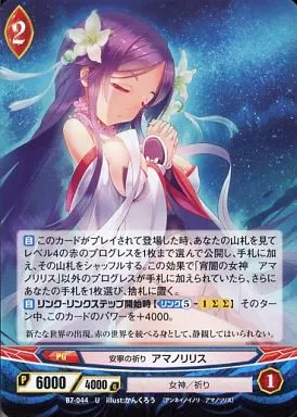 Nombre comercial en japonés: アンジュ・ヴィエルジュ/U/赤/PG/女神/祈り/ブースターパック第7章「光輝の風と深闇の盾」 B7-044[U]:安寧の祈り アマノリリス