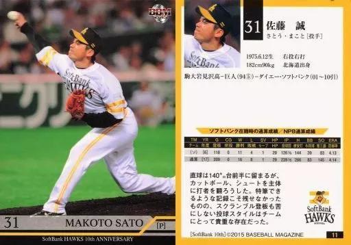Nombre comercial en japonés: BBM/レギュラーカード/球団OB/BBM2015 福岡ソフトバンクホークス10周年カード 11 [レギュラーカード] : 佐藤誠