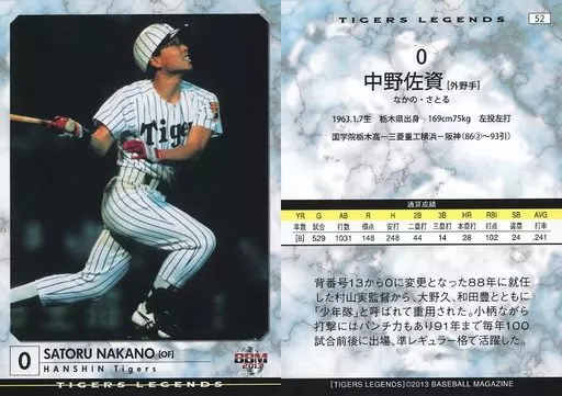 Nombre comercial en japonés: BBM/レギュラーカード/阪神タイガース/BBM2013 タイガース・レジェンド 52 [レギュラーカード] : 中野佐資