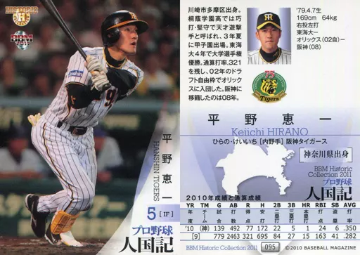 Nombre comercial en japonés: BBM/レギュラーカード/現役/阪神タイガース/BBM2011 ヒストリックコレクション 人国記 都道府県別ヒーロー列伝 095 [レギュラーカード] : 平野恵一