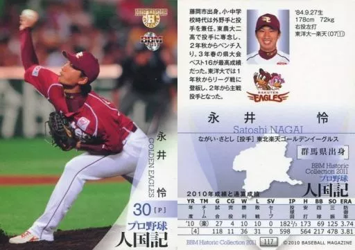 Nombre comercial en japonés: BBM/レギュラーカード/現役/東北楽天ゴールデンイーグルス/BBM2011 ヒストリックコレクション 人国記 都道府県別ヒーロー列伝 117 [レギュラーカード] : 永井怜