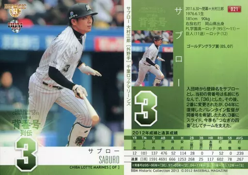 Nombre comercial en japonés: BBM/レギュラーカード/千葉ロッテマリーンズ/BBM2013 ヒストリックコレクション「プロ野球背番号列伝」 021 [レギュラーカード] : サブロー