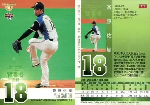 Nombre comercial en japonés: BBM/レギュラーカード/北海道日本ハムファイターズ/BBM2013 ヒストリックコレクション「プロ野球背番号列伝」 076 [レギュラーカード] : 斎藤佑樹