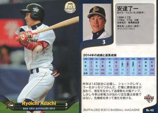 Nombre comercial en japonés: BBM/レギュラーカード/BBM2015 オリックス・バファローズ Bs42 [レギュラーカード] : 安達了一