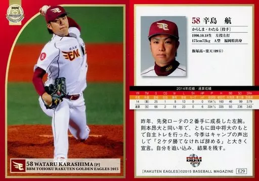 Nombre comercial en japonés: BBM/レギュラーカード/BBM2015 東北楽天ゴールデンイーグルス E29 [レギュラーカード] : 辛島航
