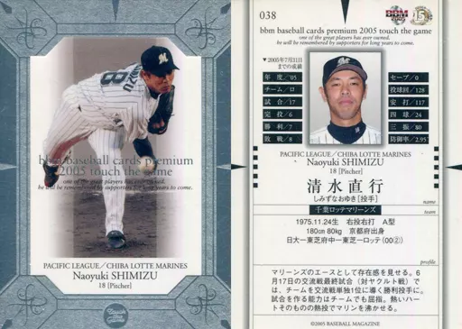 Nombre comercial en japonés: BBM/レギュラーカード/-/千葉ロッテマリーンズ/BBM2005 Touch the game(タッチ・ザ・ゲーム) 038 [レギュラーカード] : 清水直行