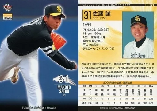Nombre comercial en japonés: BBM/レギュラーカード/BBM2007 福岡ソフトバンクホークス H027 [レギュラーカード] : 佐藤誠