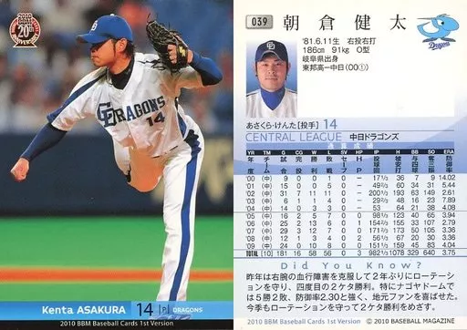 Nombre comercial en japonés: BBM/レギュラーカード/中日ドラゴンズ/BBM 2010 ベースボールカード 1stバージョン 039 [レギュラーカード] : 朝倉健太