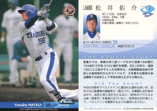 Nombre comercial en japonés: BBM/レギュラーカード/中日ドラゴンズ/BBM 2010 ベースボールカード 1stバージョン 069 [レギュラーカード] : 松井佑介