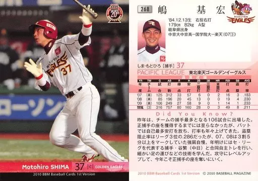 Nombre comercial en japonés: BBM/レギュラーカード/東北楽天ゴールデンイーグルス/BBM 2010 ベースボールカード 1stバージョン 268 [レギュラーカード] : 嶋基宏