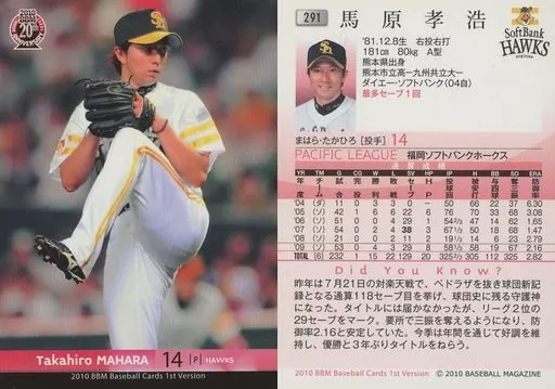 Nombre comercial en japonés: BBM/レギュラーカード/福岡ソフトバンクホークス/BBM 2010 ベースボールカード 1stバージョン 291 [レギュラーカード] : 馬原孝浩