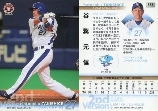 Nombre comercial en japonés: BBM/レギュラーカード/中日ドラゴンズ/BBM 2010 ベースボールカード 2ndバージョン 536 [レギュラーカード] : 谷繁元信