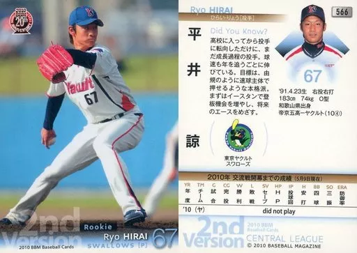Nombre comercial en japonés: BBM/レギュラーカード/東京ヤクルトスワローズ/BBM 2010 ベースボールカード 2ndバージョン 566 [レギュラーカード] : 平井諒