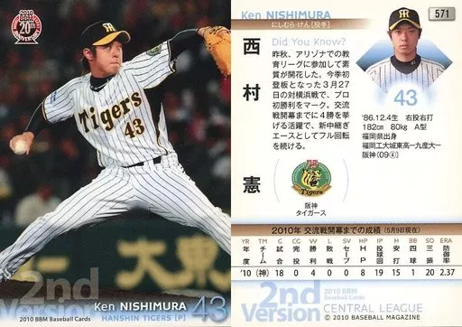 Nombre comercial en japonés: BBM/レギュラーカード/阪神タイガース/BBM 2010 ベースボールカード 2ndバージョン 571 [レギュラーカード] : 西村憲