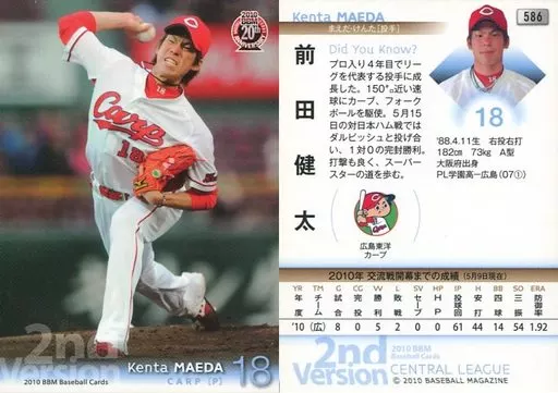 Nombre comercial en japonés: BBM/レギュラーカード/広島東洋カープ/BBM 2010 ベースボールカード 2ndバージョン 586 [レギュラーカード] : 前田健太