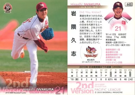 Nombre comercial en japonés: BBM/レギュラーカード/東北楽天ゴールデンイーグルス/BBM 2010 ベースボールカード 2ndバージョン 641 [レギュラーカード] : 岩隈久志