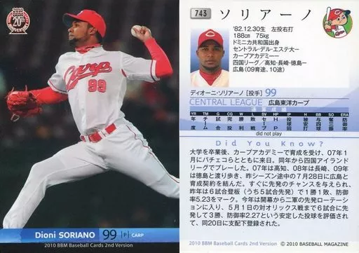 Nombre comercial en japonés: BBM/レギュラーカード/広島東洋カープ/BBM 2010 ベースボールカード 2ndバージョン 743 [レギュラーカード] : ソリアーノ