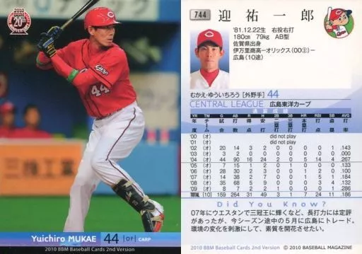 Nombre comercial en japonés: BBM/レギュラーカード/広島東洋カープ/BBM 2010 ベースボールカード 2ndバージョン 744 [レギュラーカード] : 迎祐一郎