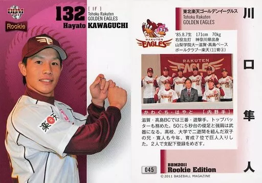 Nombre comercial en japonés: BBM/レギュラーカード/ルーキーレギュラー/東北楽天ゴールデンイーグルス/BBM2011 ルーキーエディション 045 [レギュラーカード] : 川口隼人