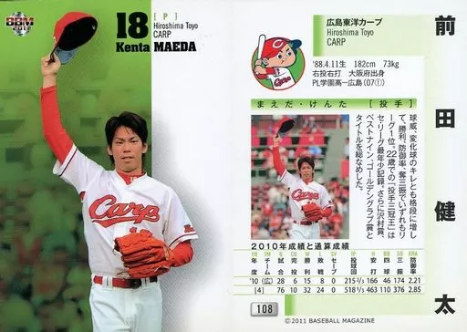 Nombre comercial en japonés: BBM/レギュラーカード/現役レギュラー/広島東洋カープ/BBM2011 ルーキーエディション 108 [レギュラーカード] : 前田健太