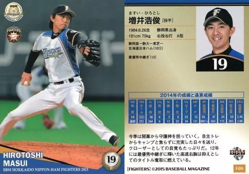 Nombre comercial en japonés: BBM/レギュラーカード/BBM2015 北海道日本ハムファイターズ F09 [レギュラーカード] : 増井浩俊