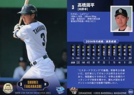 Nombre comercial en japonés: BBM/レギュラーカード/BBM2015 中日ドラゴンズ D44 [レギュラーカード] : 高橋周平