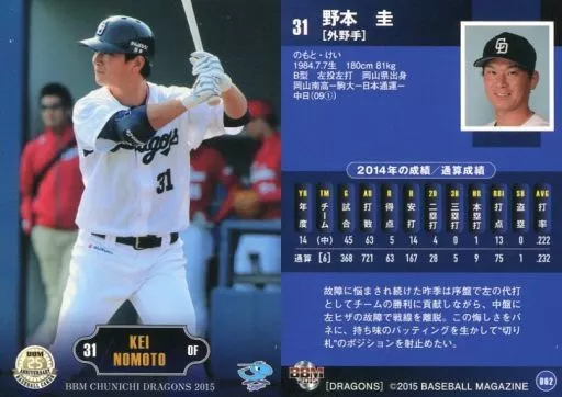 Nombre comercial en japonés: BBM/レギュラーカード/BBM2015 中日ドラゴンズ D62 [レギュラーカード] : 野本圭