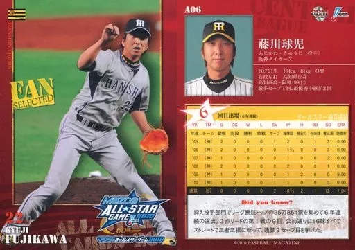 Nombre comercial en japonés: BBM/阪神タイガース/BBM2010 オールスターカード A06 : 藤川球児