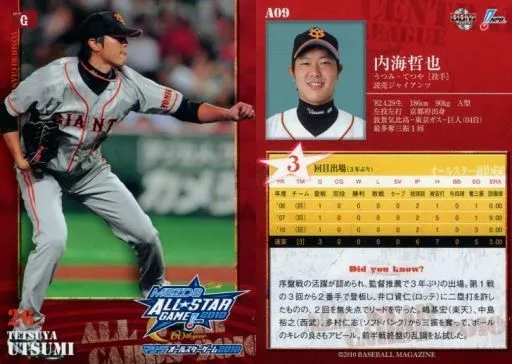 Nombre comercial en japonés: BBM/読売ジャイアンツ/BBM2010 オールスターカード A09 : 内海哲也