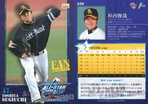 Nombre comercial en japonés: BBM/福岡ソフトバンクホークス/BBM2010 オールスターカード A36 : 杉内俊哉