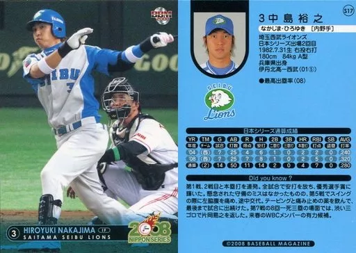 Nombre comercial en japonés: BBM/埼玉西武ライオンズ/BBM2008 第59回日本シリーズカードセット S17 : 中島裕之