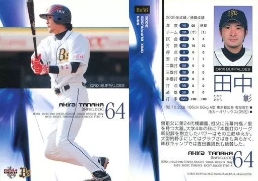 Nombre comercial en japonés: BBM/レギュラーカード/BBM2006 オリックス・バファローズ Bs56 [レギュラーカード] : 田中彰