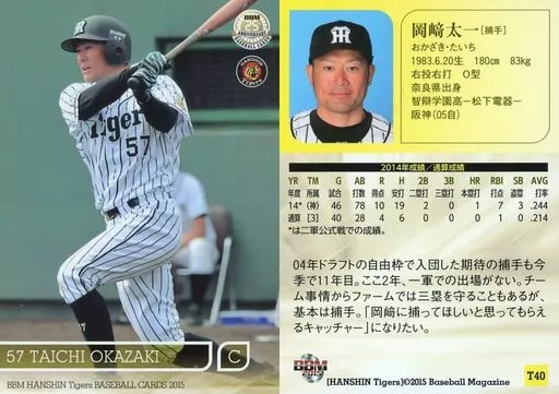 Nombre comercial en japonés: BBM/レギュラーカード/BBM2015 阪神タイガース T40 [レギュラーカード] : 岡崎太一