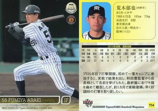 Nombre comercial en japonés: BBM/レギュラーカード/BBM2015 阪神タイガース T54 [レギュラーカード] : 荒木郁也