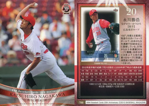 Nombre comercial en japonés: BBM/レギュラーカード/現役/広島東洋カープ/BBM2010 BBMカード20周年記念カード 146 [レギュラーカード] : 永川勝浩